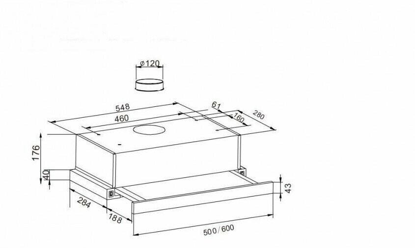 Form factor: built-in, width: 50 cm, depth: 28.40 cm, operating modes: drain / circulation, installation location: in a cabinet, maximum productivity: 400 m³/hour, filter: grease, control type: mechanical, lighting type