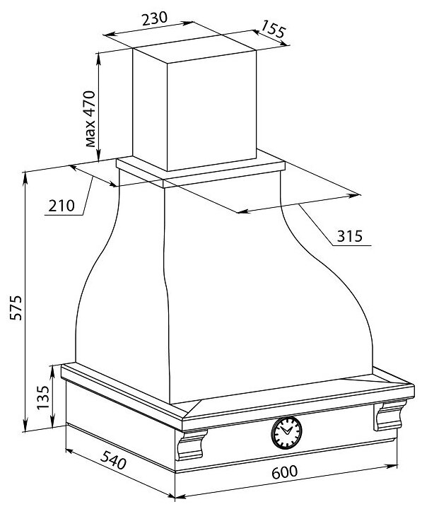 Form factor: dome, width: 60 cm, depth: 54 cm, operating modes: exhaust / circulation, maximum productivity: 510 m³/hour, installation type: wall-mounted, filter: grease, control type: mechanical, lighting type: laminated
