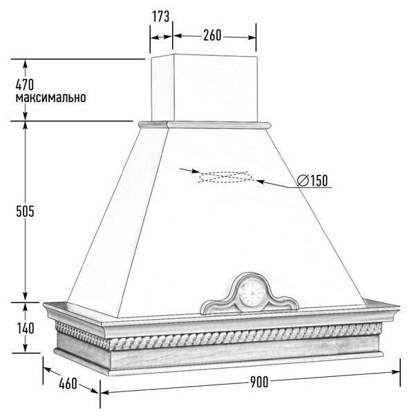 Form factor: dome, width: 60 cm, depth: 46 cm, operating modes: exhaust / circulation, maximum productivity: 550 m³/hour, installation type: wall-mounted, filter: grease, control type: mechanical, lighting type: laminated