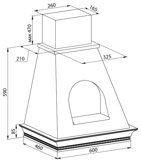 Form factor: dome, width: 90 cm, depth: 46 cm, operating modes: exhaust / circulation, maximum productivity: 650 m³/hour, installation type: wall-mounted, filter: grease, control type: mechanical, lighting type: gal