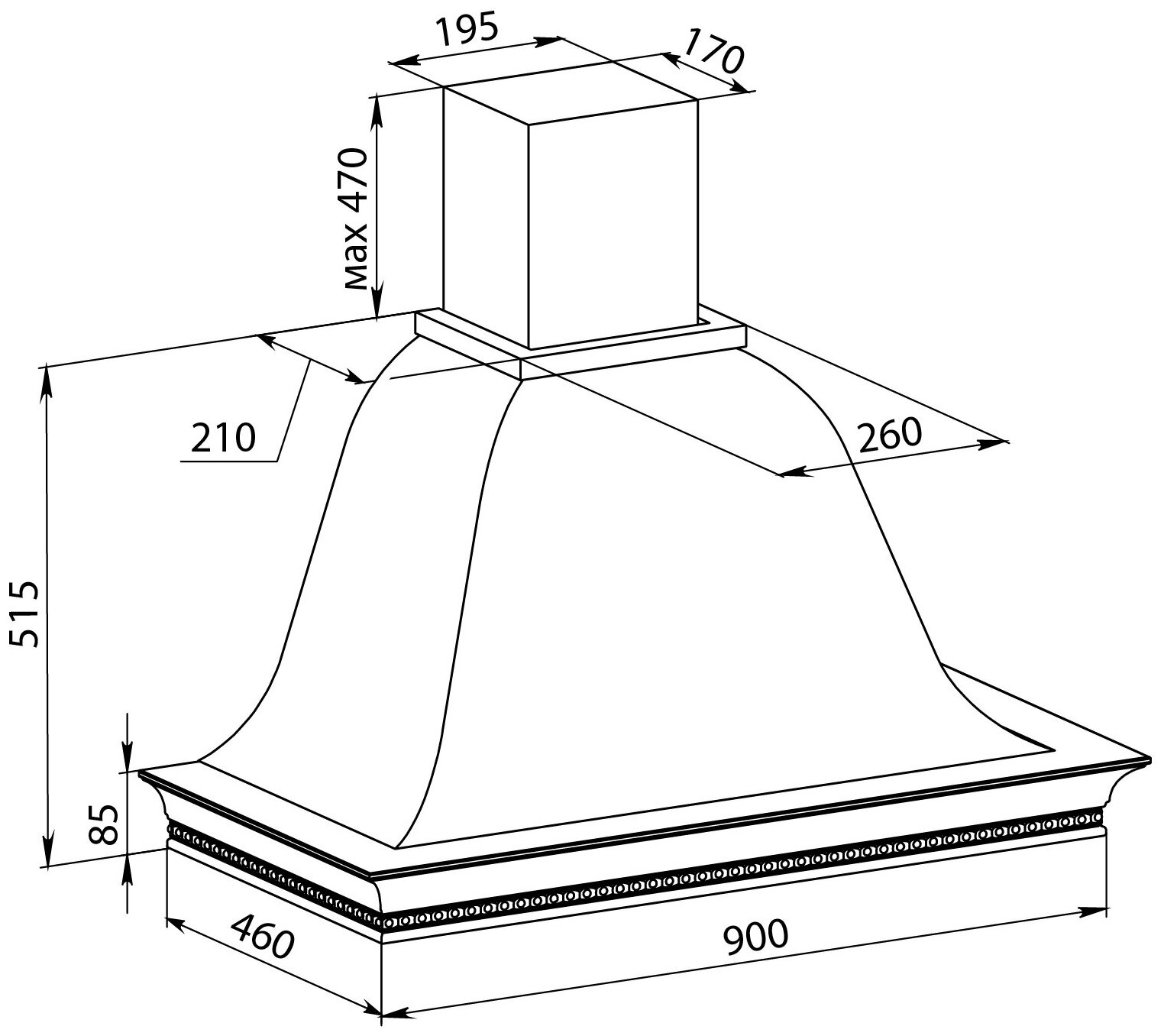 Description: Form factor: dome, width: 90 cm, depth: 46 cm, operating modes: exhaust / circulation, maximum productivity: 510 m³/hour, installation type: wall-mounted, filter: grease, control type: mechanical, lighting type: gal