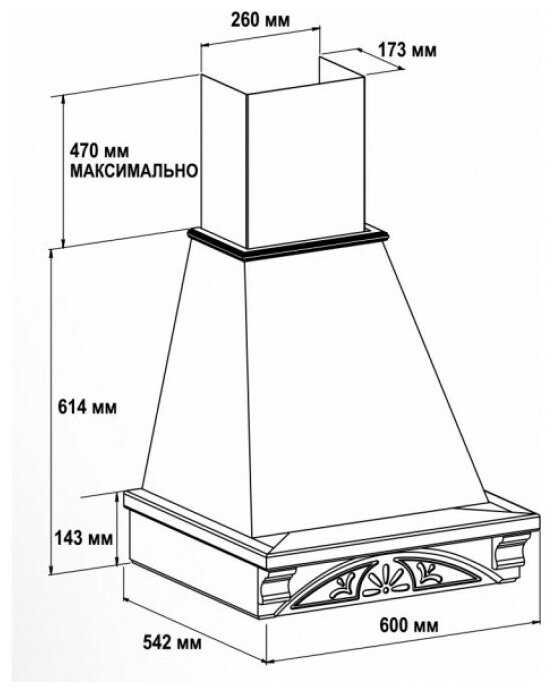 Form factor: dome, width: 60 cm, depth: 54 cm, operating modes: exhaust / circulation, maximum productivity: 510 m³/hour, installation type: wall-mounted, filter: grease, control type: mechanical, lighting type: laminated