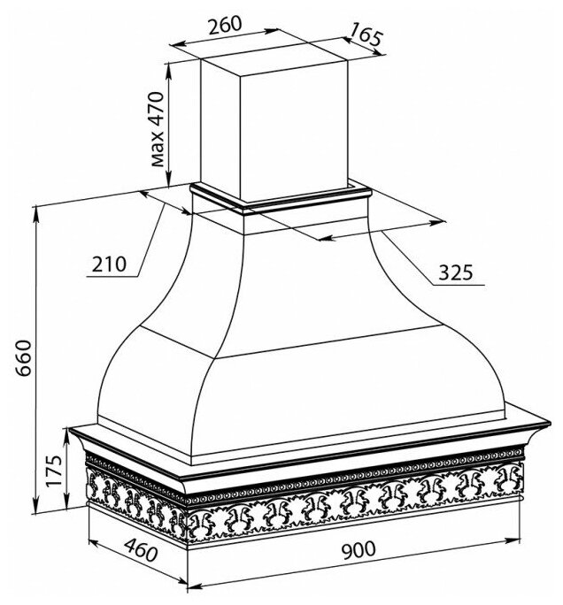 Form factor: dome, width: 90 cm, depth: 46 cm, operating modes: exhaust / circulation, maximum productivity: 360 m³/hour, installation type: wall-mounted, filter: grease, control type: mechanical, lighting type: laminated