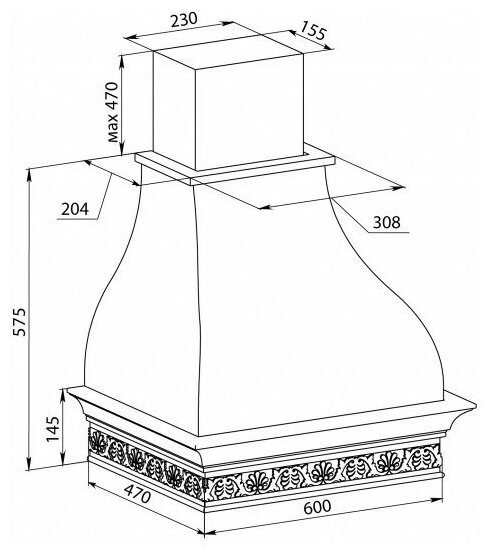Form factor: dome, width: 60 cm, depth: 47 cm, operating modes: exhaust / circulation, maximum productivity: 550 m³/hour, installation type: wall-mounted, filter: grease, control type: mechanical, lighting type: laminated