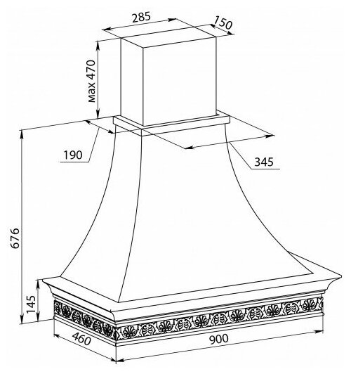 Form factor: dome, width: 90 cm, depth: 46 cm, operating modes: exhaust / circulation, maximum productivity: 650 m³/hour, installation type: wall-mounted, filter: grease, control type: mechanical, lighting type: laminated