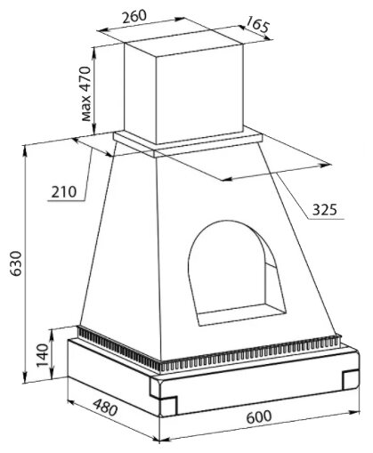 Form factor: dome, width: 60 cm, depth: 48 cm, operating modes: exhaust / circulation, maximum productivity: 900 m³/hour, installation type: wall-mounted, filter: grease, control type: mechanical, lighting type: laminated