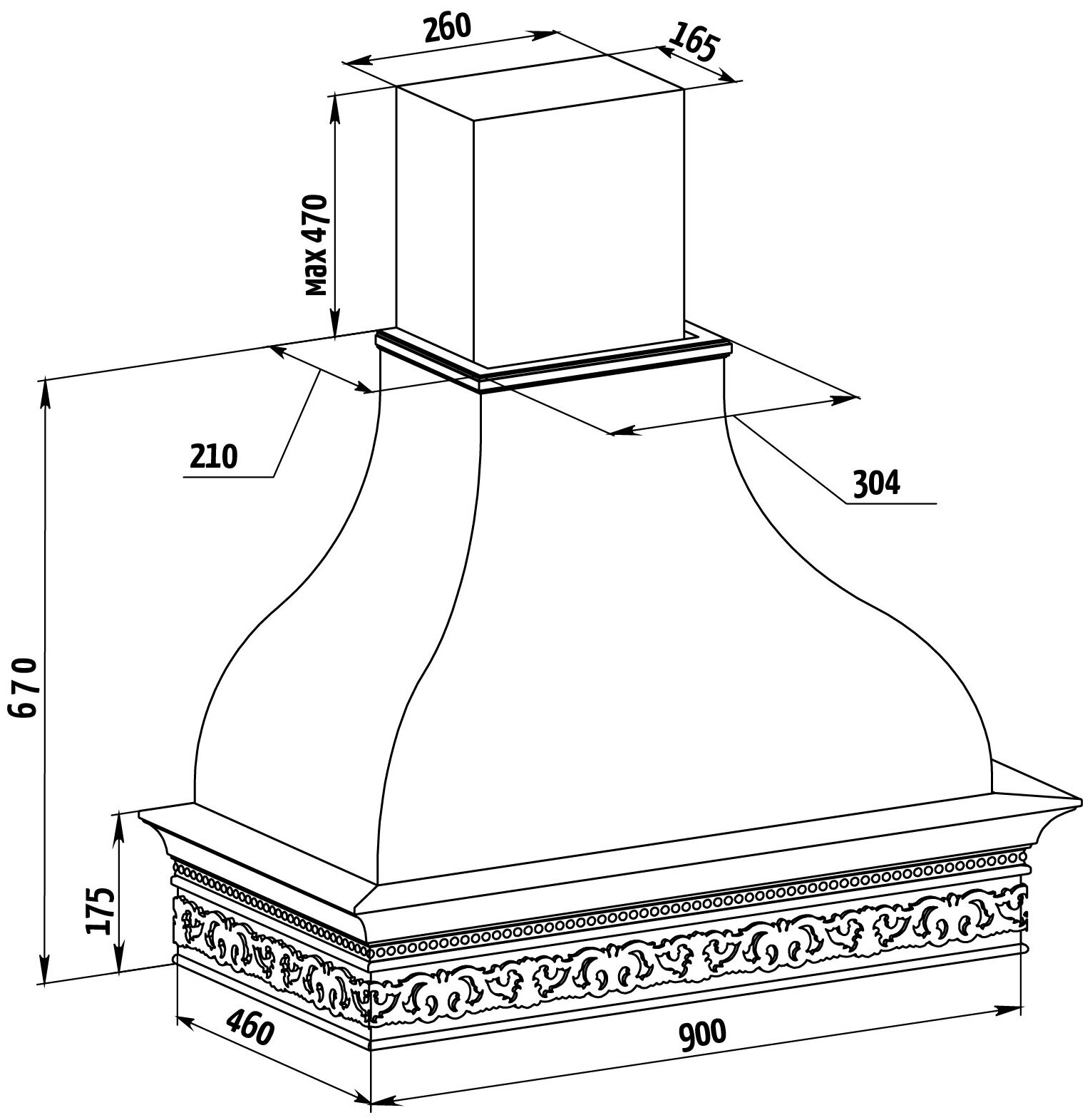 Form factor: dome, width: 90 cm, depth: 46 cm, operating modes: exhaust / circulation, maximum productivity: 650 m³/hour, installation type: wall-mounted, filter: grease, control type: mechanical, lighting type: laminated