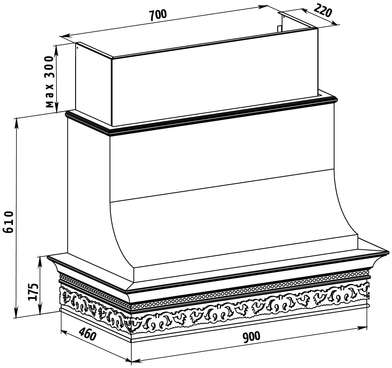 Form factor: dome, width: 90 cm, depth: 46 cm, operating modes: exhaust / circulation, maximum productivity: 510 m³/hour, installation type: wall-mounted, filter: grease, control type: mechanical, lighting type: laminated
