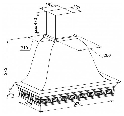 Form factor: dome, width: 90 cm, depth: 47 cm, operating modes: exhaust / circulation, maximum productivity: 510 m³/hour, installation type: wall-mounted, filter: grease, control type: mechanical, lighting type: laminated