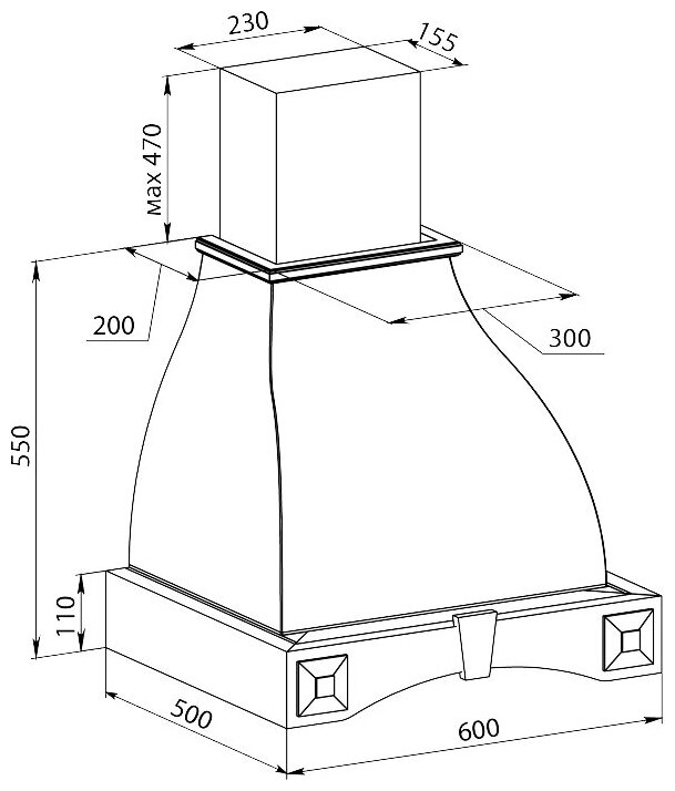 Form factor: dome, width: 60 cm, depth: 50 cm, operating modes: exhaust / circulation, maximum productivity: 900 m³/hour, installation type: wall-mounted, filter: grease, control type: mechanical, lighting type: laminated
