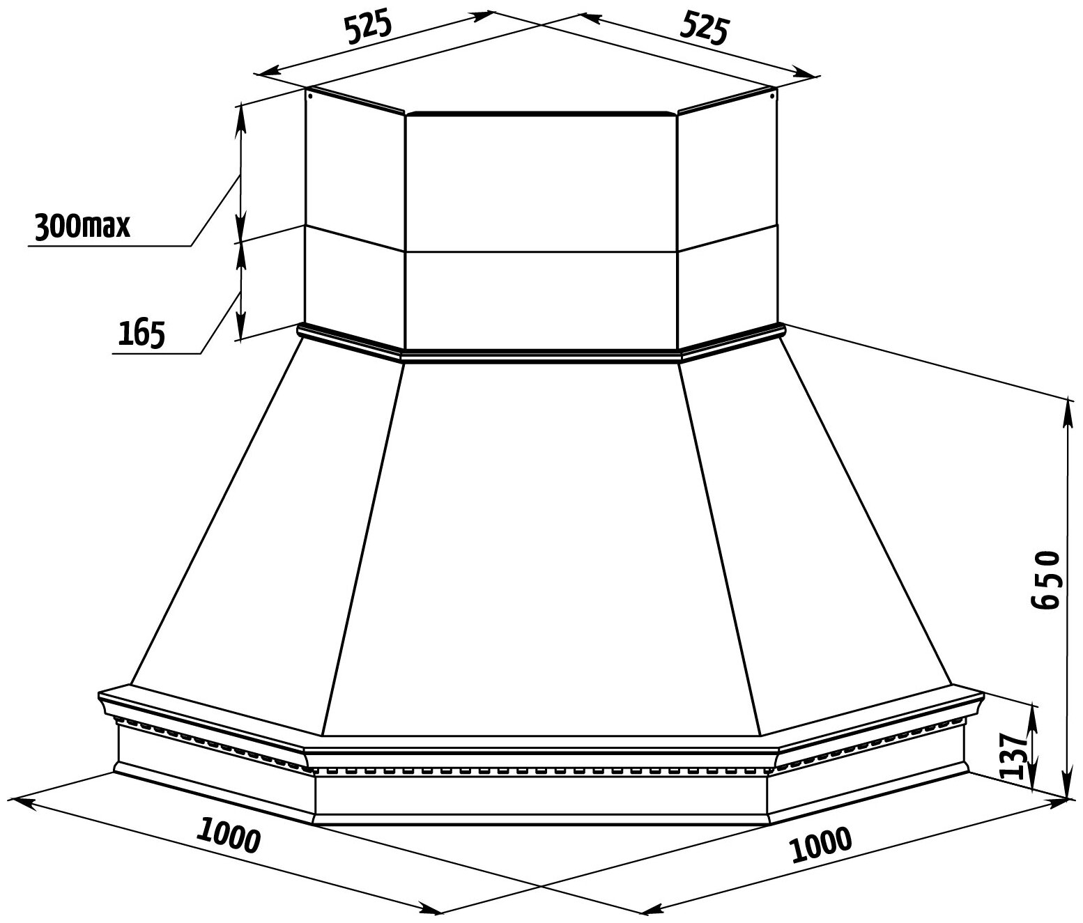Form factor: dome, width: 100 cm, depth: 100 cm, operating modes: exhaust / circulation, maximum productivity: 650 m³/hour, installation type: corner, filter: grease, control type: mechanical, lighting type: halogen