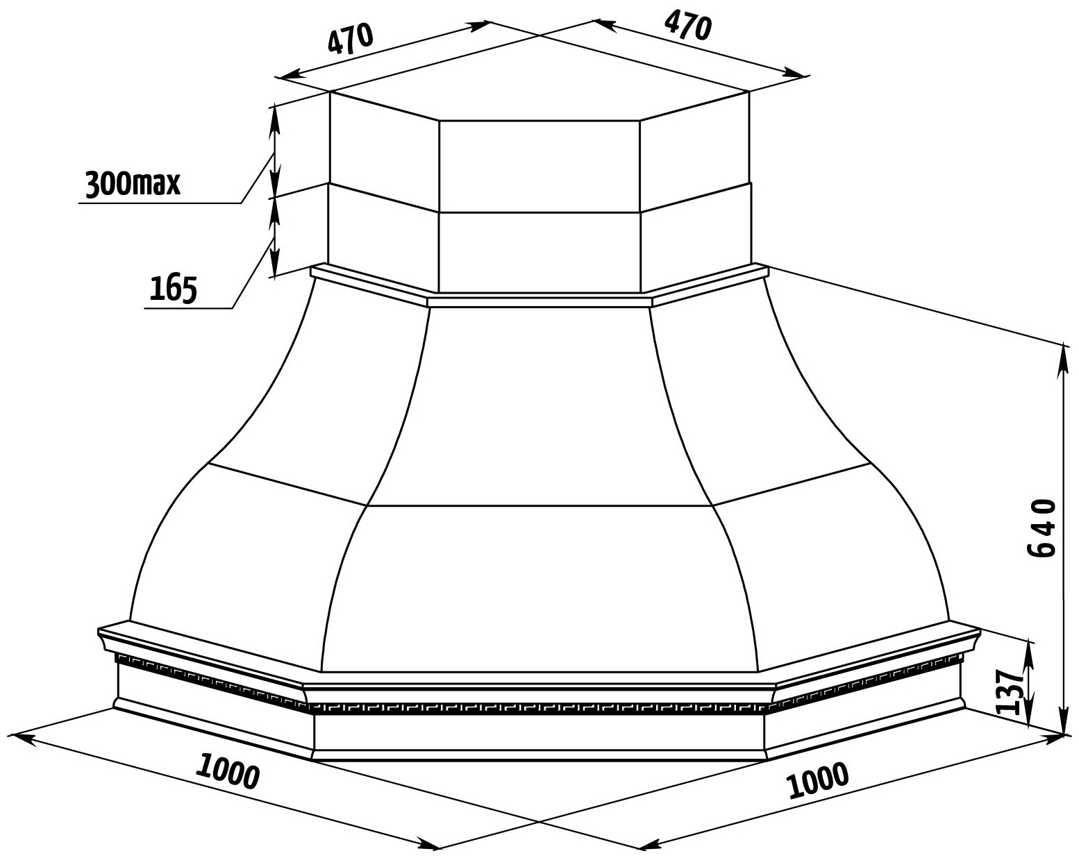 Form factor: dome, width: 100 cm, depth: 100 cm, operating modes: exhaust / circulation, maximum productivity: 650 m³/hour, installation type: corner, filter: grease, control type: mechanical, lighting type: halogen