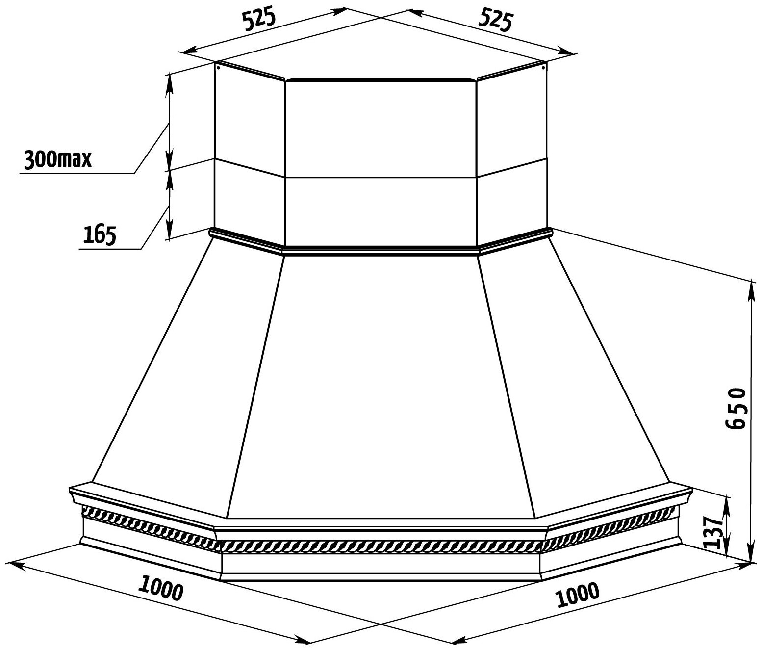Form factor: dome, width: 100 cm, depth: 100 cm, operating modes: exhaust / circulation, maximum productivity: 360 m³/hour, installation type: corner, filter: grease, control type: mechanical, lighting type: halogen