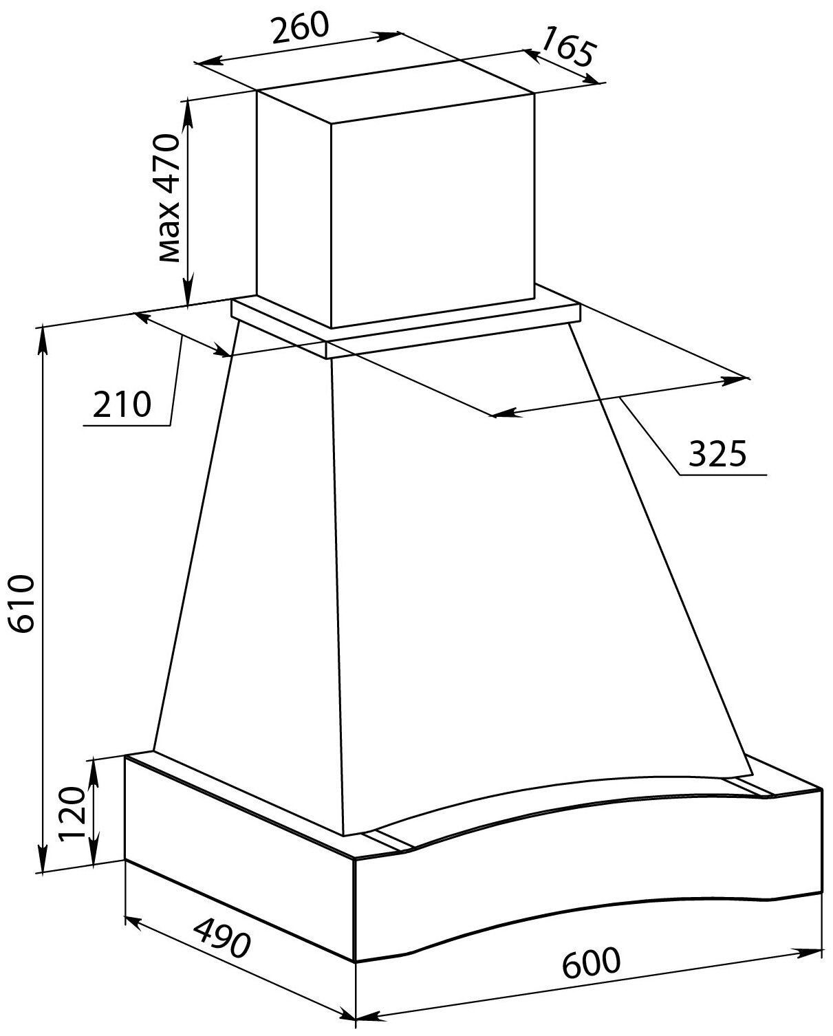 Form factor: dome, width: 60 cm, depth: 49 cm, operating modes: exhaust / circulation, maximum productivity: 900 m³/hour, installation type: wall-mounted, filter: grease, control type: mechanical, lighting type: gal