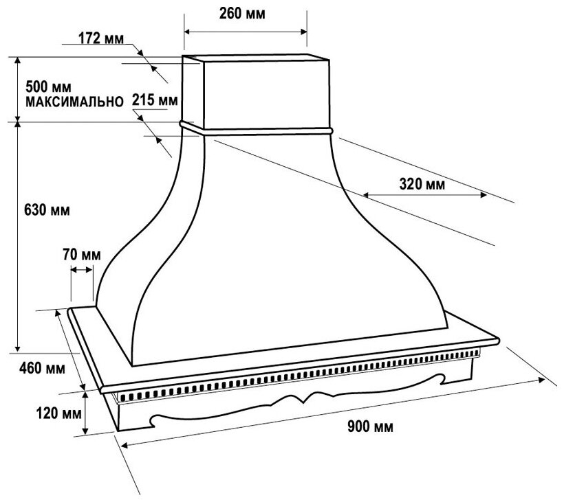 Description: Form factor: dome, width: 90 cm, depth: 46 cm, operating modes: exhaust / circulation, maximum productivity: 550 m³/hour, installation type: wall-mounted, filter: grease, control type: mechanical, lighting type: gal