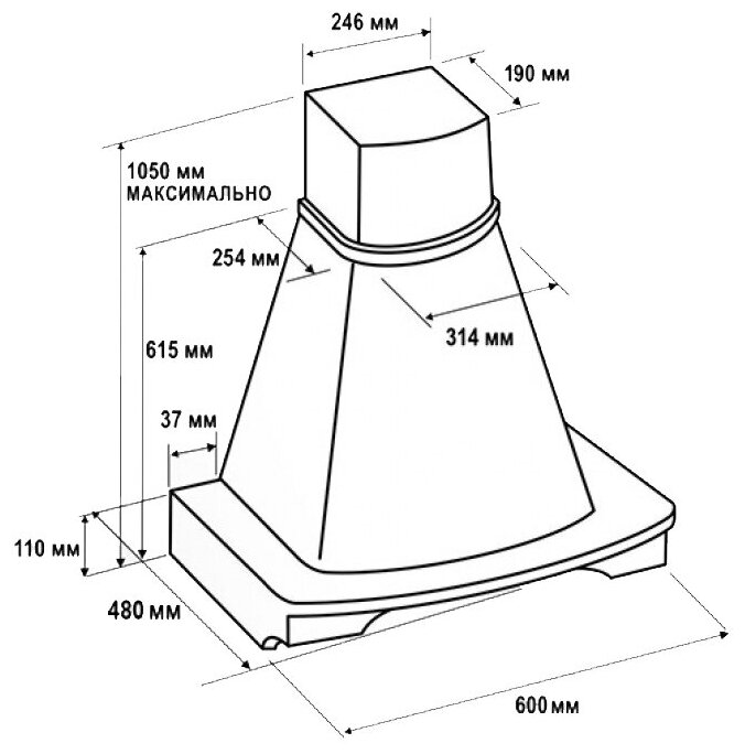 Form factor: dome, width: 60 cm, depth: 48 cm, operating modes: exhaust / circulation, maximum productivity: 650 m³/hour, installation type: wall-mounted, filter: grease, control type: mechanical, lighting type: laminated