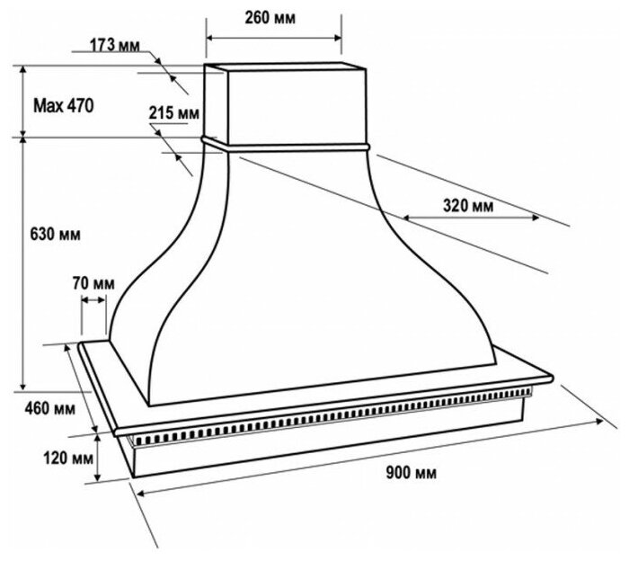 Form factor: dome, width: 90 cm, operating modes: exhaust / circulation, maximum productivity: 650 m³/hour, installation type: wall-mounted, filter: grease, control type: mechanical, lighting type: incandescent