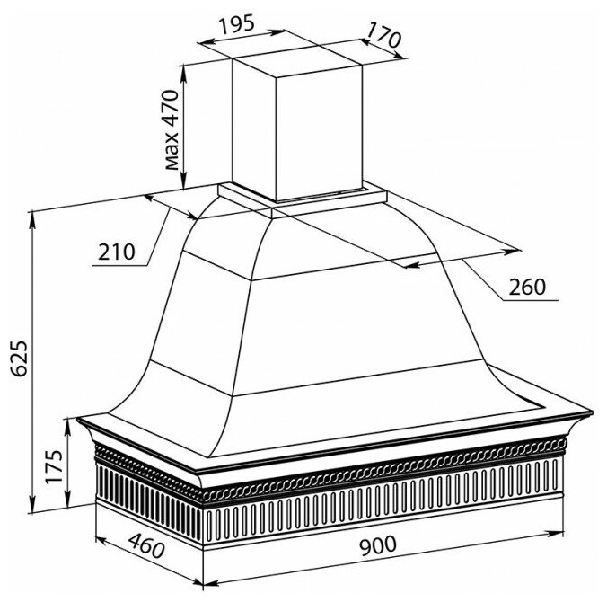 Form factor: dome, width: 90 cm, depth: 46 cm, operating modes: exhaust / circulation, maximum productivity: 900 m³/hour, installation type: wall-mounted, filter: grease, control type: mechanical, lighting type: laminated