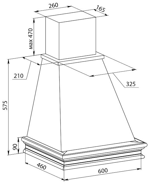 Form factor: dome, width: 60 cm, depth: 46 cm, operating modes: exhaust / circulation, maximum productivity: 750 m³/hour, installation type: wall-mounted, filter: grease, control type: mechanical, lighting type: laminated