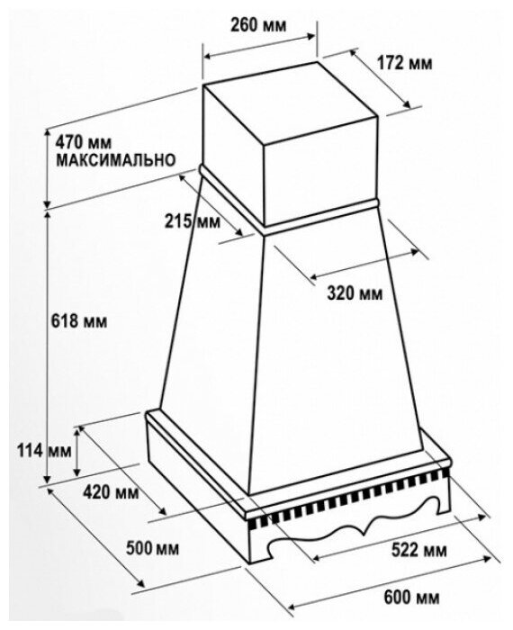 Form factor: dome, width: 60 cm, depth: 50 cm, operating modes: exhaust / circulation, maximum productivity: 750 m³/hour, installation type: wall-mounted, filter: grease, control type: mechanical, lighting type: laminated