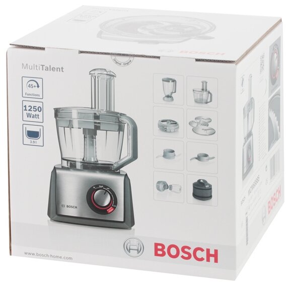 Type: food processor, power: 1250 W, bowl material: plastic, bowl capacity: 3.90 l, grater, dough attachment, juicer: no, blender, features: pulse mode, design features: rubberized feet