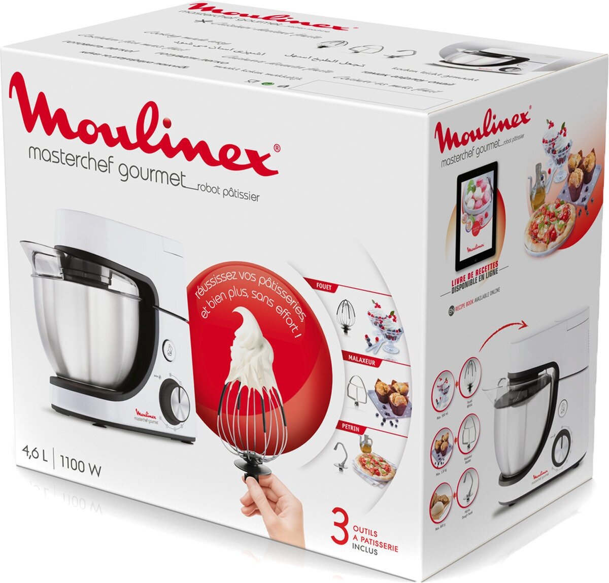 Type: kitchen machine, power: 1100 W, bowl material: stainless steel, bowl capacity: 4.60 l, dough attachment, juicer: no, features: overload protection, pulse mode, design features: rubberized