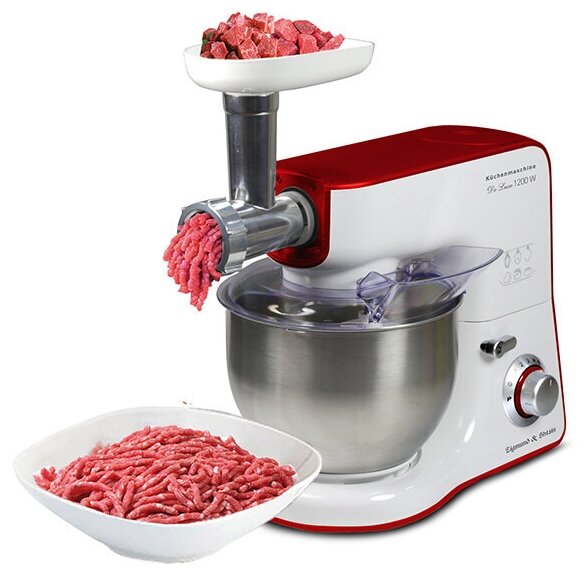 Type: kitchen machine, power: 1200 W, bowl material: stainless steel, bowl capacity: 5 l, dough attachment, juicer: no, meat grinder, blender, features: pulse mode, planetary movement, design features