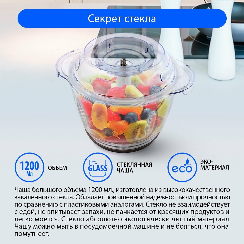 Type: chopper, power: 1000 W, bowl material: glass, bowl capacity: 1.20 l, juicer: no, features: overload protection, design features: rubberized feet, number of speeds: 1