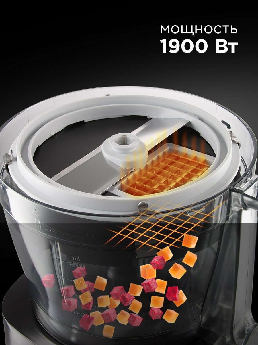 Type: food processor, power: 1900 W, bowl material: plastic, bowl capacity: 3.50 l, grater, juicer: no, features: overload protection, pulse mode, design features: storage space for attachments and accessories