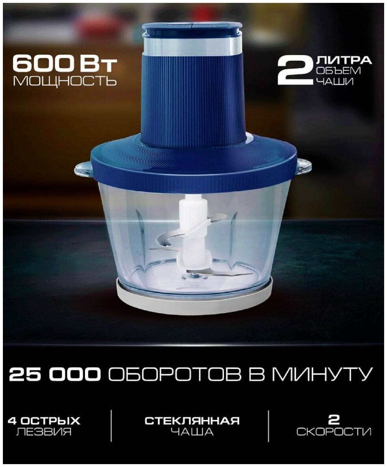 Type: chopper, power: 600 W, bowl material: plastic, bowl capacity: 2 l, juicer: no, meat grinder, blender, features: overload protection, pulse mode, number of speeds: 2