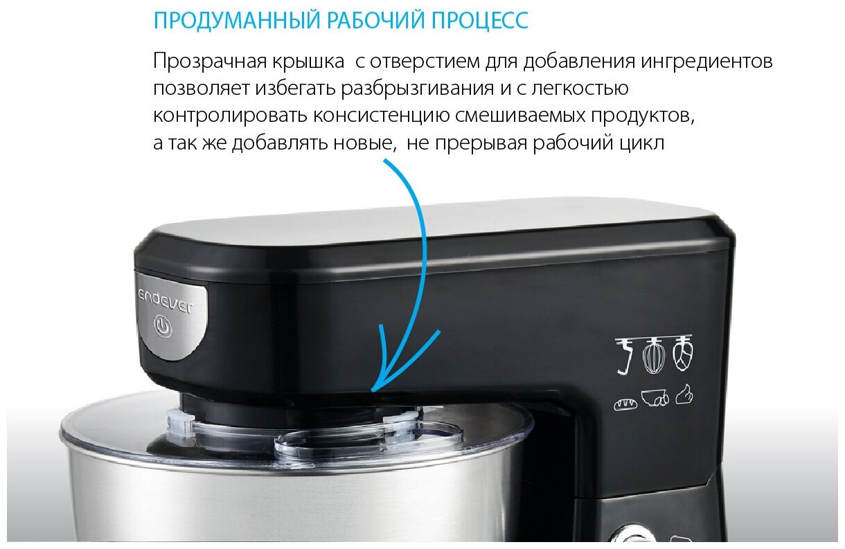 Rated voltage 220 V, 50 Hz; overall dimensions 33 x 21.5 x 28 cm; stable base; folding top console for removing the bowl; steel bowl with lid; rubberized legs; quiet operation; delivery set: planetary