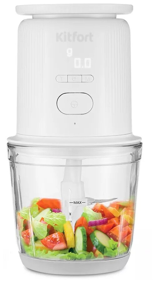 Type: chopper, power: 120 W, bowl material: glass, bowl capacity: 0.60 l, grater, multi-cutter, juicer: no, features: built-in scales, display, overload protection, design features: rubberized blade