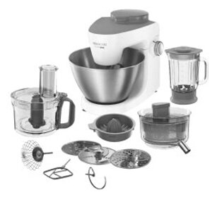 Type: food processor, power: 1000 W, bowl material: stainless steel, bowl capacity: 4.30 l, grater, dough attachment, juicer: citrus/universal, blender, design features: compartment for power cord