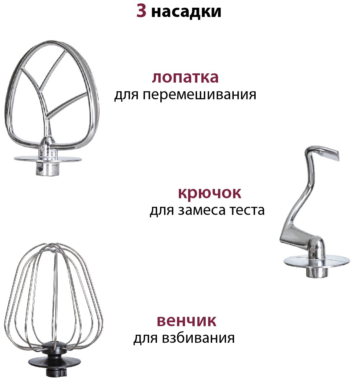 Type: planetary stationary, power: 1200 W, attachments: whisk for whipping, hooks for kneading dough, spatula, bowl material: stainless steel, bowl volume: 6 l, body material: metal, plastic, additional cutters