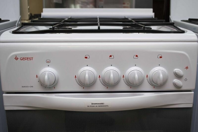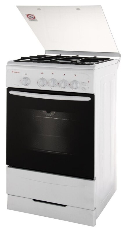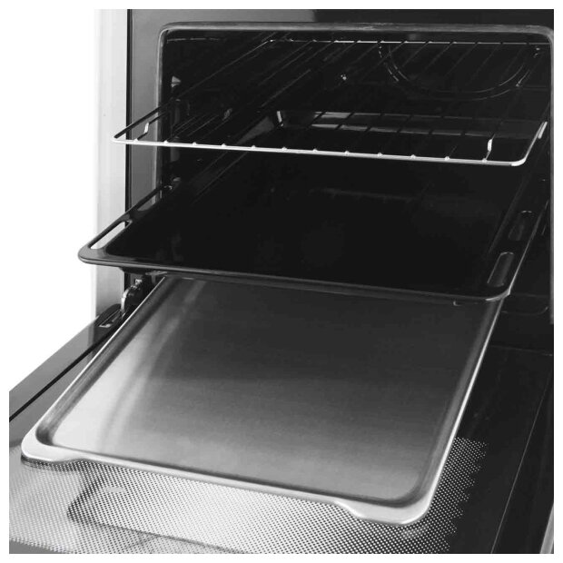 Steel table burner grates; stamped oven guides; oven temperature gauge; glass cover; adjustable legs; electrical safety class: II; net weight: 39.5 kg