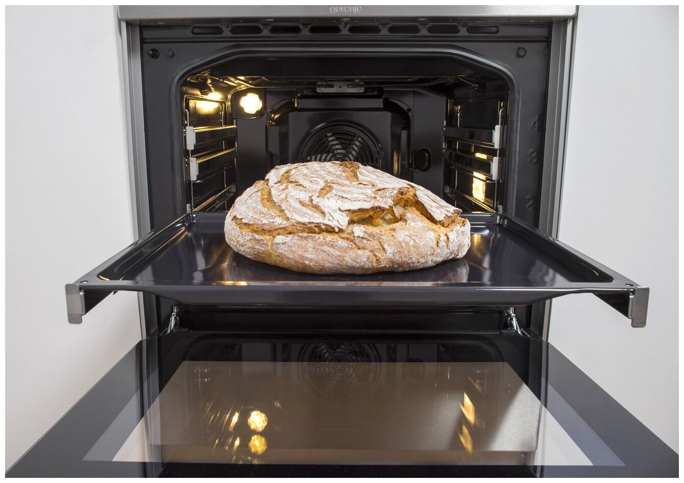 Display, oven light, telescopic guides, clock, utensil drawer