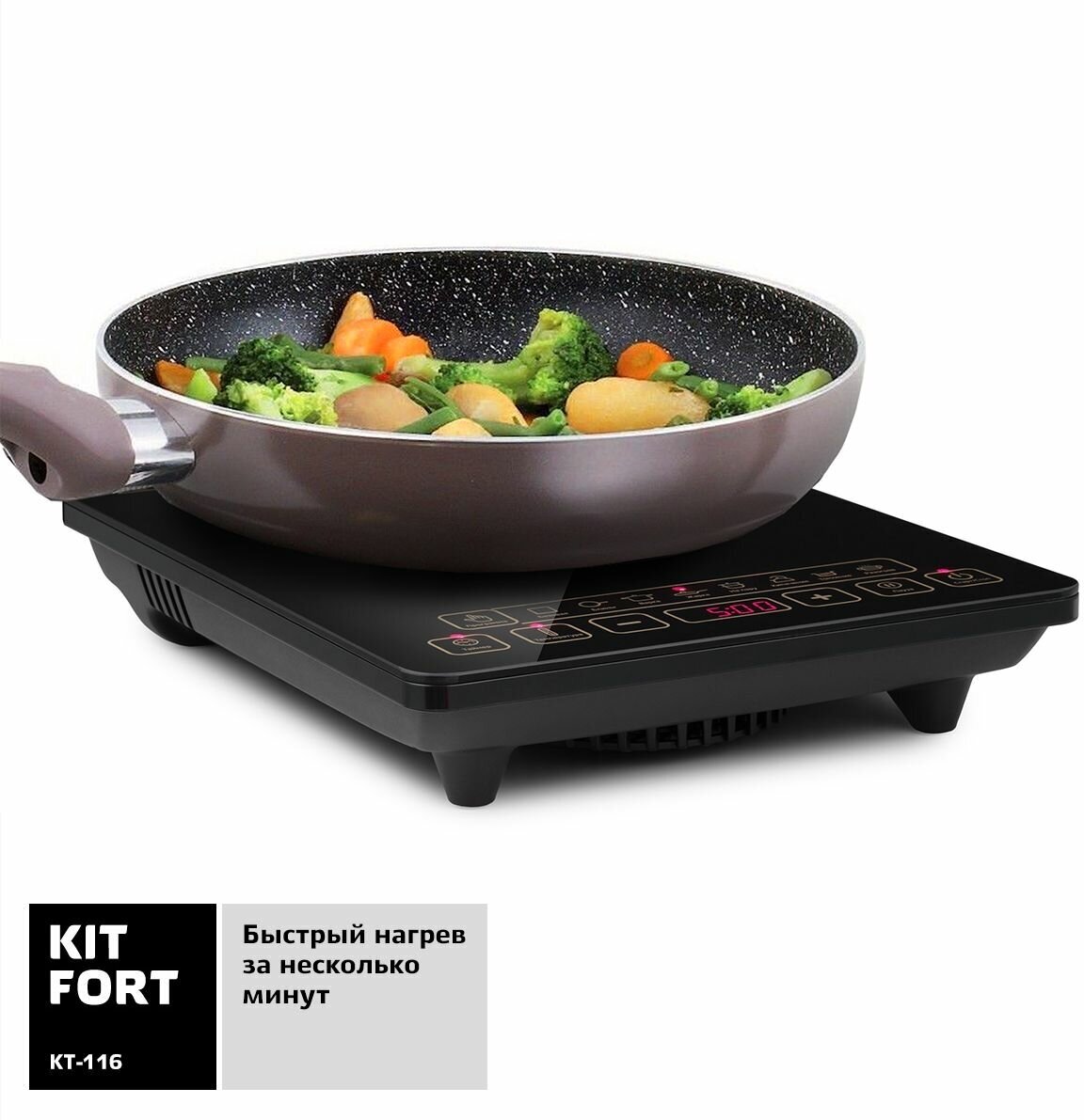 6 power and 6 temperature operating modes; 8 preset programs: basic, pancakes, cooking, frying, steaming, boiling, simmering, warming up; The recommended bottom diameter of the dishes used is from 12 to 18 cm.
