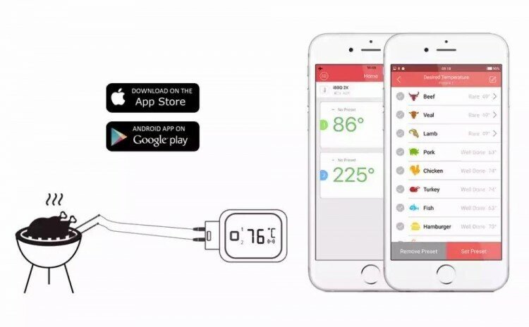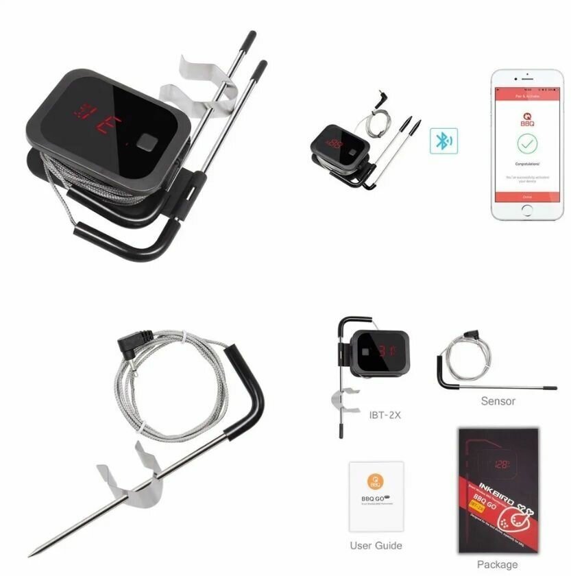 Bluetooth wireless thermometer; 2 probes, sensor length: about 115cm, overheat alarm, range alarm, countdown alarm; 2 AAA batteries extra.
