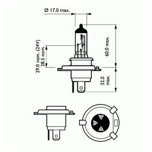 Type: halogen, size: H4, purpose: low/high beam, fog lights, For low/high beam, base: P43t, P43t-38, luminous flux: 1815 lm, power: 1.09 W, voltage: 12 V