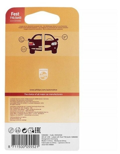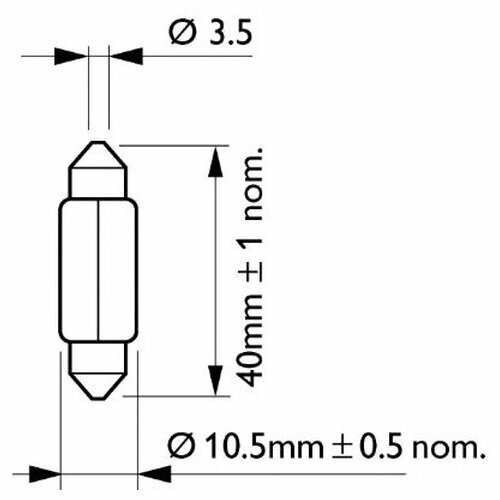 Type: incandescent, size: C10W, C5W, T10, T10.5x43, purpose: license plate lighting, interior lighting, reversing lights, base: SV8.5, luminous flux: 115 lm, power: 10 W, voltage: 12 V