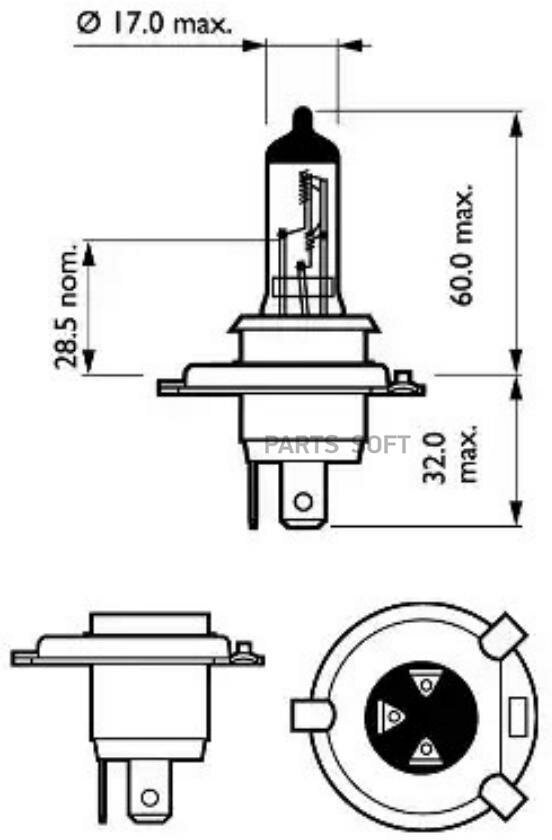 Type: halogen, size: H4, purpose: low beam, low/high beam, high beam, base: P43t, P43t-38, luminous flux: 1650 lm, power: 60 W, voltage: 12 V