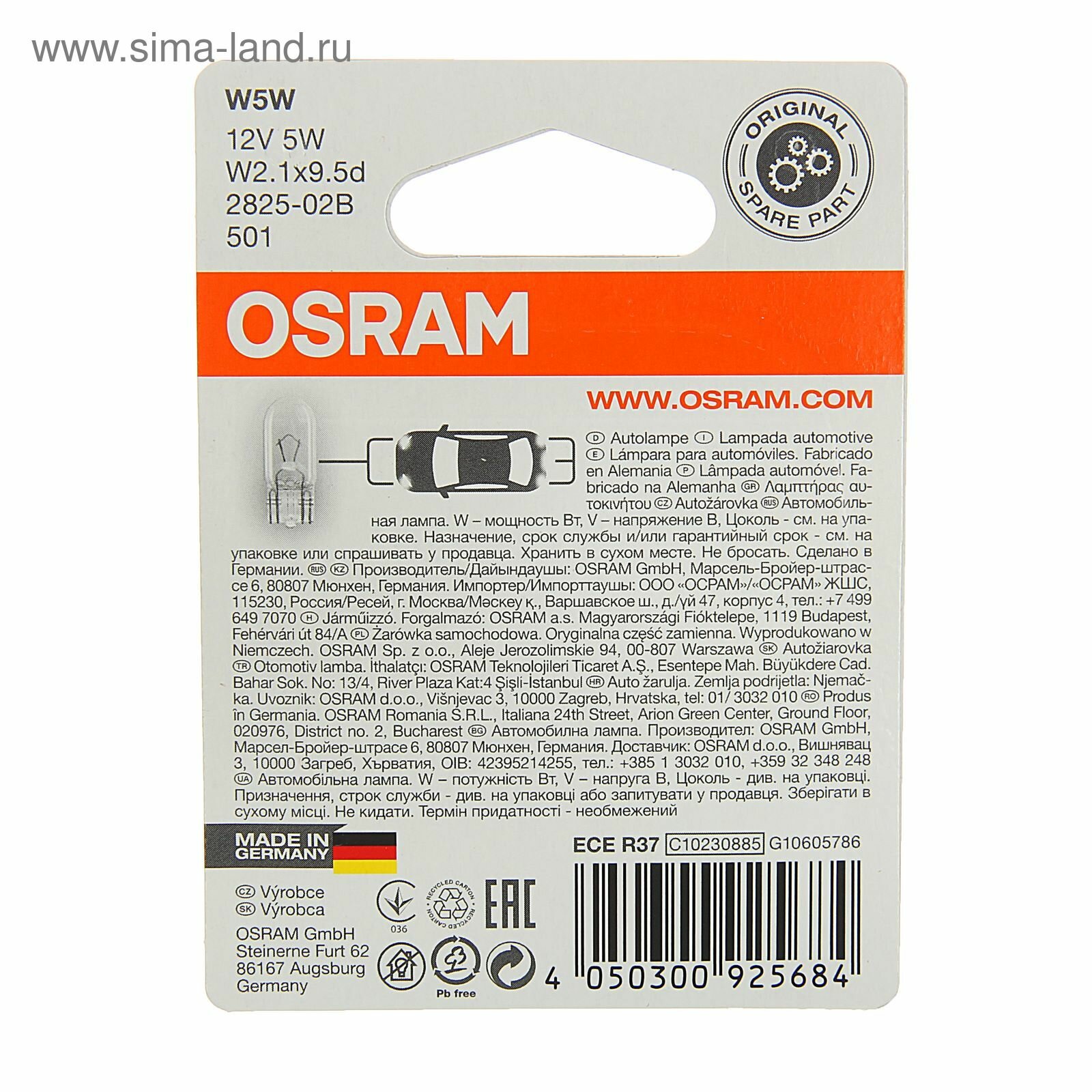 Type: incandescent, standard size: W5W, purpose: license plate lighting, dashboard, interior lighting, brake lights, parking lights, side direction indicators, For side lights, base: W2.1×9.5d, W2.1x9.5D, St.