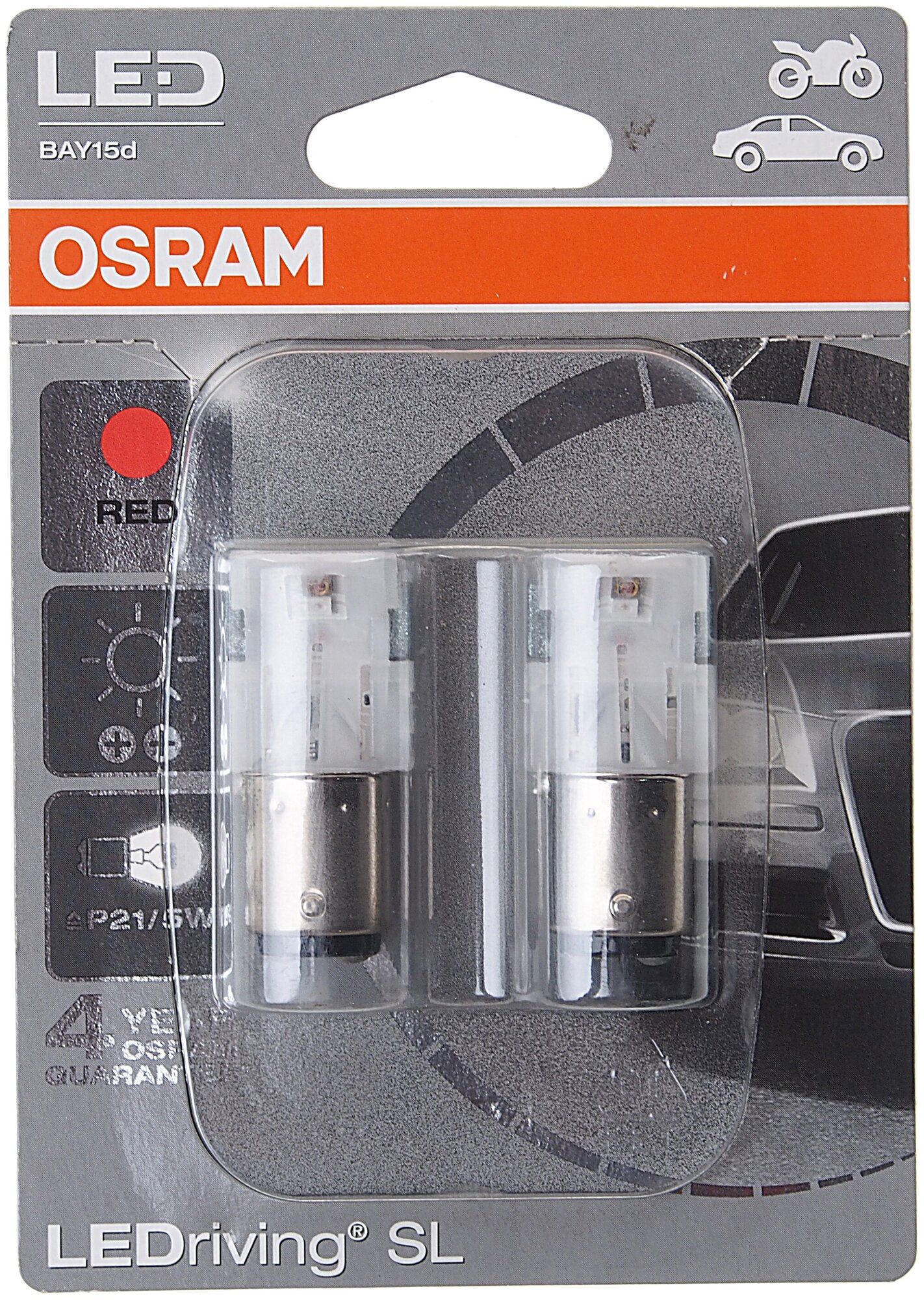 Car lamp P21/5W BAY15d LED STANDART RED blister, 2pcs 12V OSRAM /1/5 NEW