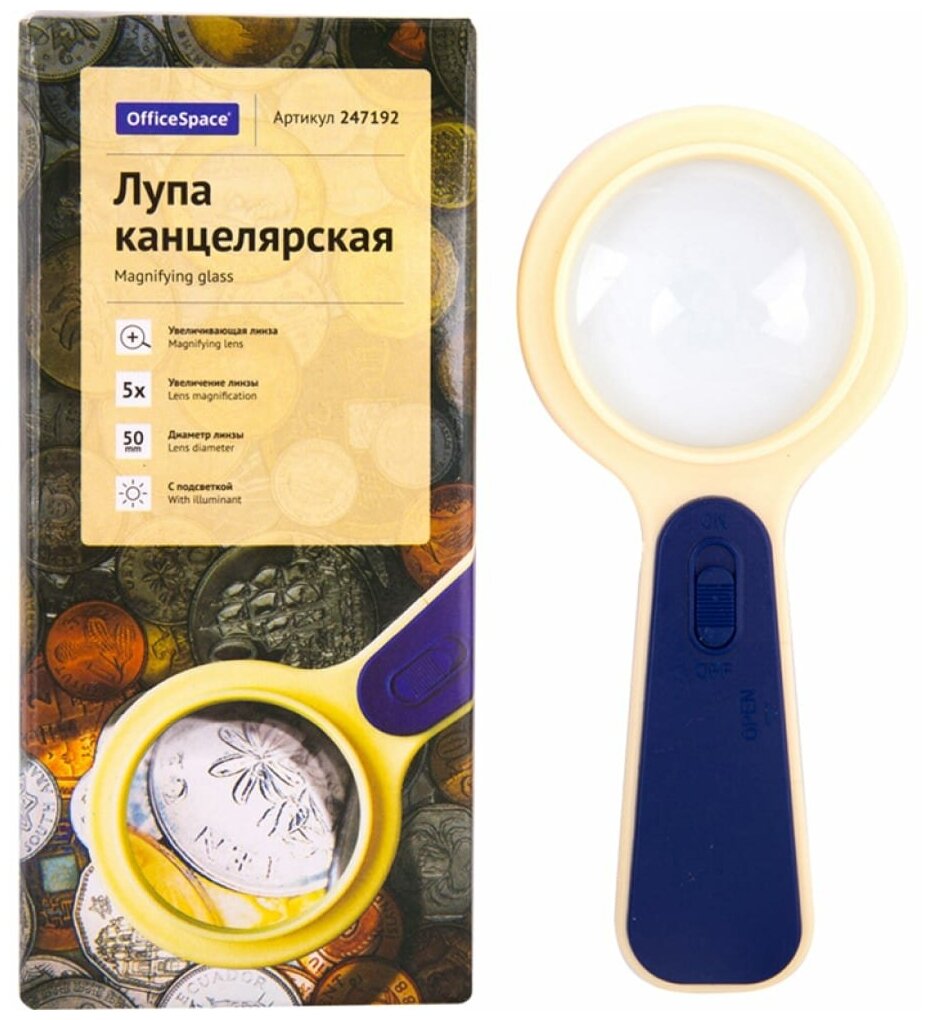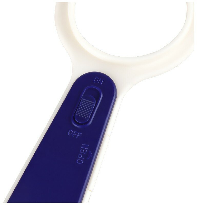 Purpose: viewing, design: with handle, magnification factor: 5, backlit, lens shape: round, lens diameter: 50 mm, lens material: glass, frame/case material: plastic