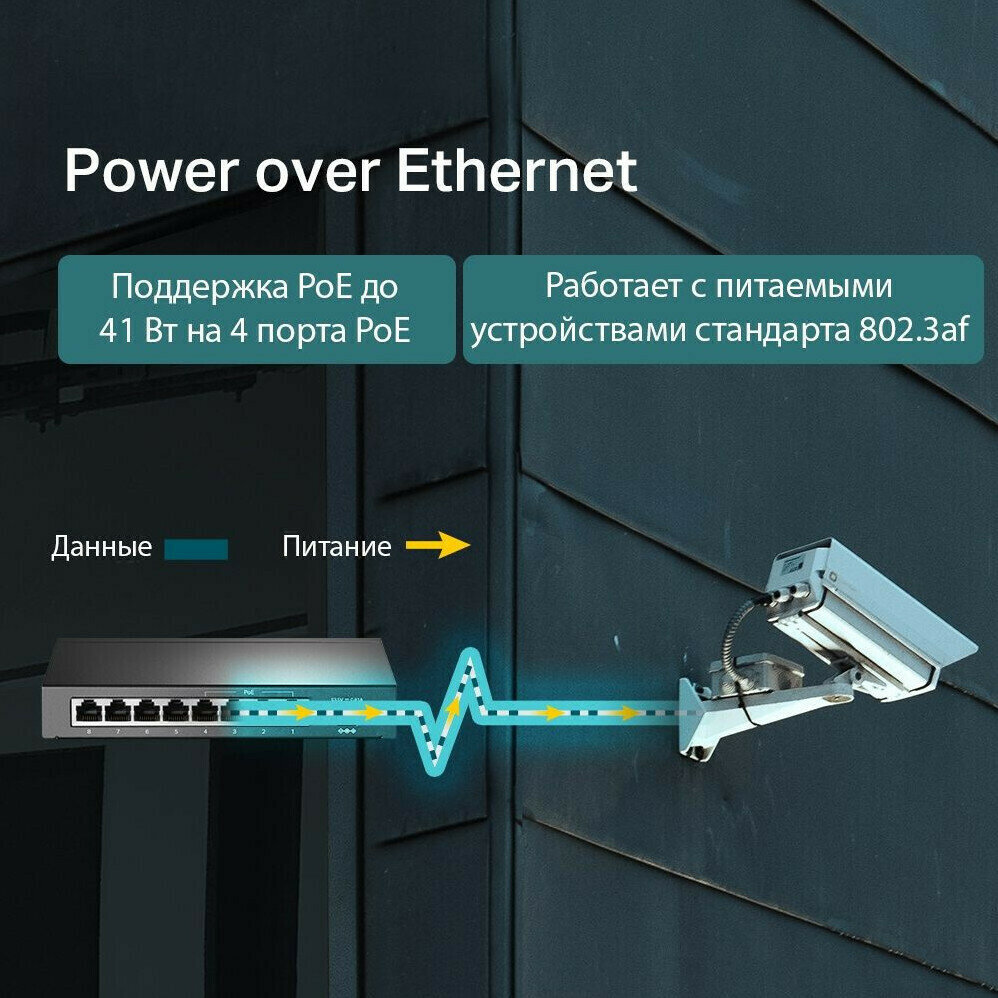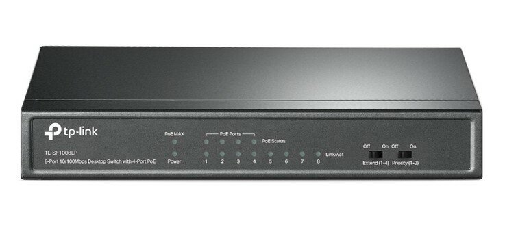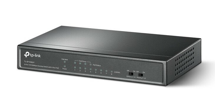 4 PoE ports, Plug and Play, PoE range for video surveillance - up to 250 m; ability to assign high priority to ports 1-2