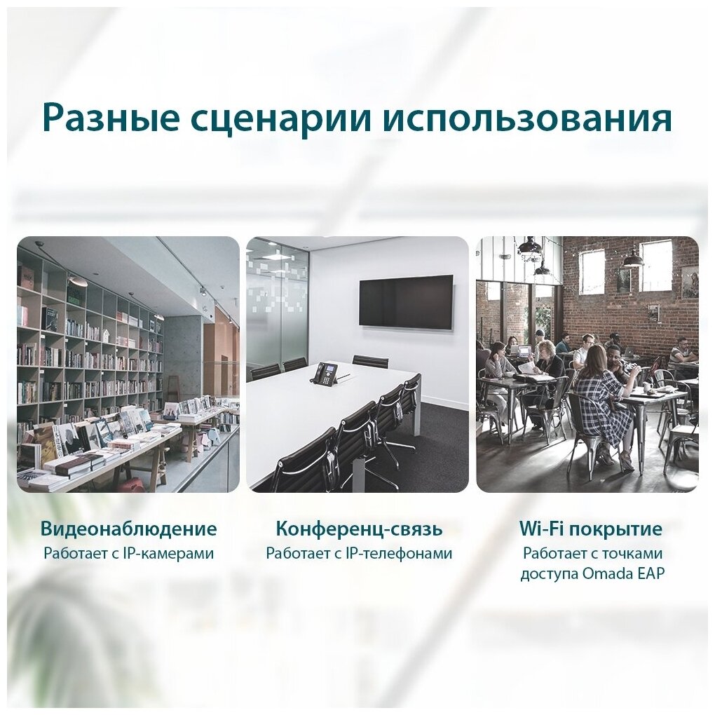 4 PoE ports, Plug and Play, PoE range for video surveillance - up to 250 m; ability to assign high priority to ports 1-2