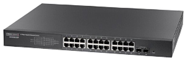 Number of LAN ports: 24, basic data transfer rate: 1 Gbit/s, network standards: IEEE 802.1d Spanning Tree, IEEE 802.1p Priority tags, IEEE 802.1q VLAN, Jumbo Frame, MDI/MDIX auto-detection