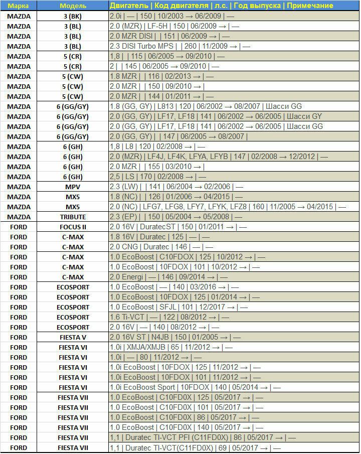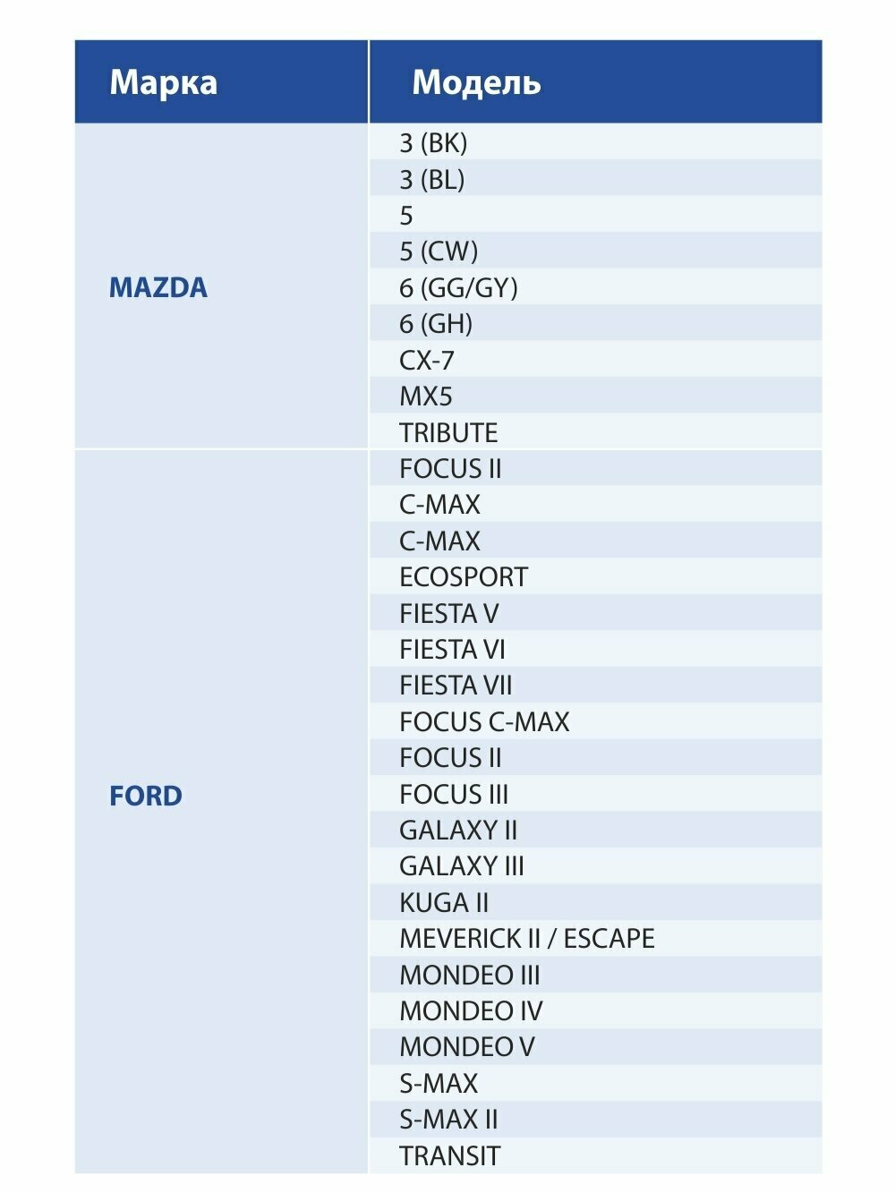 Ford C-Max, Ford EcoSport, Ford Escape, Ford Fiesta, Ford Focus, Ford Galaxy, Ford Kuga, Ford Maverick, Ford Mondeo, Ford S-Max, Ford Transit, Great Wall Safe, Mazda 3, Mazda 5, Mazda 6, Mazda CX-7, Mazda MX-5, Mazda Tribute