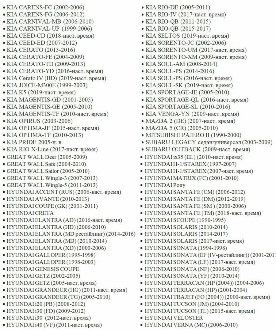 BMW M3, Fiat Coupe, Genesis G70, Great Wall Safe, Hyundai Accent, Hyundai Creta, Hyundai Elantra, Hyundai Galloper, Hyundai Genesis, Hyundai Getz, Hyundai Grandeur, Hyundai Lantra, Hyundai Matrix, Hyundai Santa Fe, Hyundai Solaris, Hyundai Sonata, Hyundai