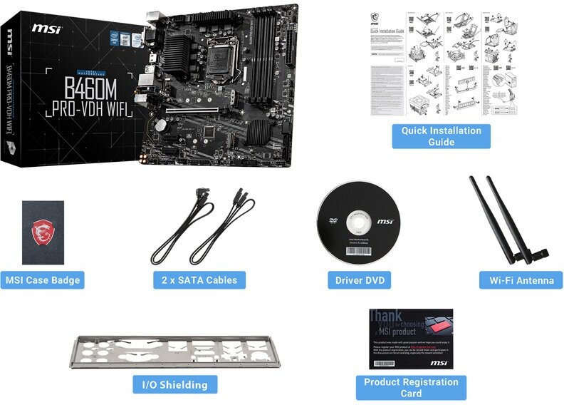 Socket: LGA1200, chipset name: Intel B460, form factor: microATX, processor manufacturer: Intel, memory type: DDR4 DIMM, number of memory slots: 4, number of M.2 slots: 2, number of PCI-E x16 slots: 1, Number of PCI-E x1 slots: 2, wireless